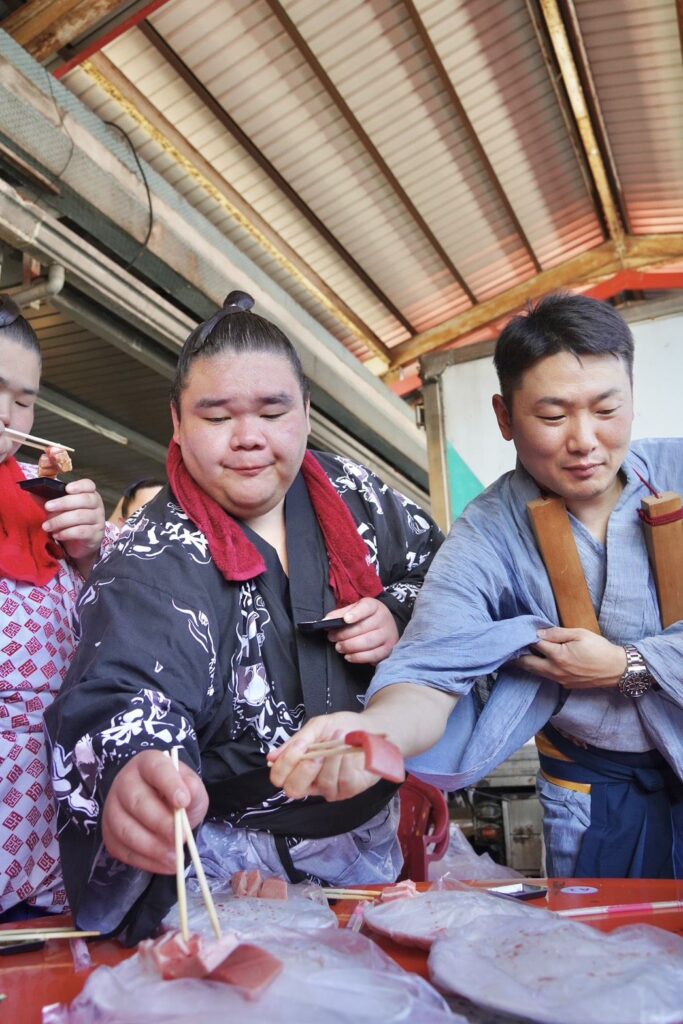 9日一早,在縣府團隊邀請下,一行人於東港魚市場展開「扛黑鮪魚、猜重量」與「運魚PK賽」試煉。由3至4位錣山部屋力士嘗試將黑鮪魚扛起,並猜測重量為220公斤;屏東隊則猜228公斤,由東港區漁會總幹事鄭鈺宸擔任「重量考官」,最後實際秤出重量為224公斤,日本隊成功勝出。