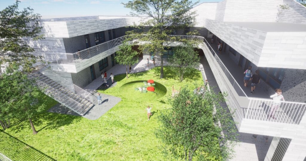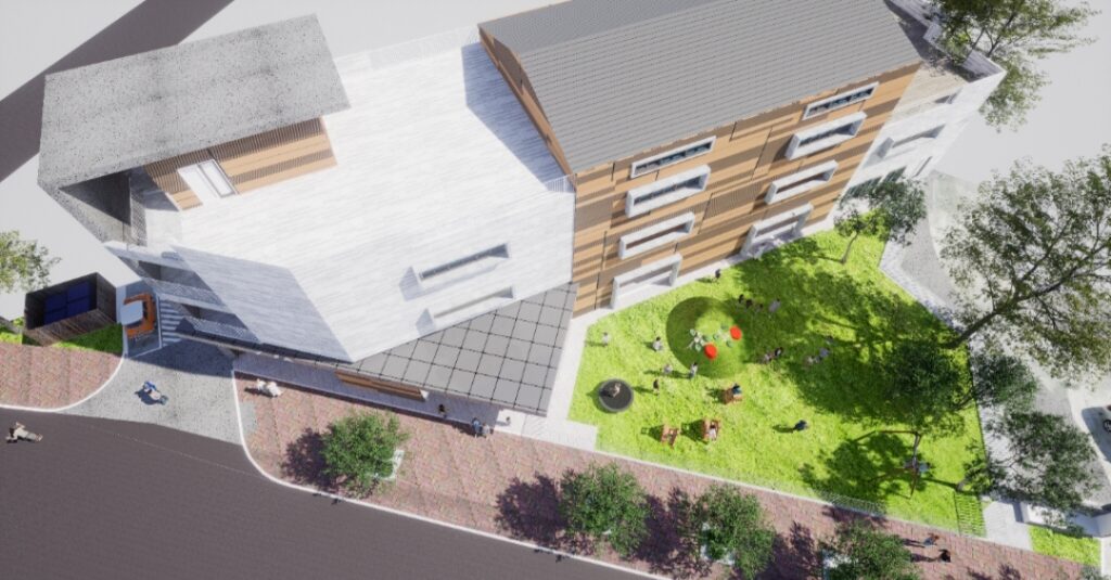 「大成非營利幼兒園」位於八德區廣福路,基地面積約2,055平方公尺,建築為地上3層,規劃2歲班活動室2間、3至5歲班活動室4間,預計可容納約128名幼兒,園內設施包含辦公室兼健康中心、遊戲室、教保準備室、會議室、多功能活動室、多功能戶外活動平台、廚房與廁所,以及相關附屬空間等,另規劃戶外遊戲空間與家長接送區,並設置汽車及機車停放空間。本案建築量體順應基地長形地貌配置,設計理念以「遊戲活動空間」為核心,採用單側走廊教室形式,透過半戶外走廊與戶外空間串聯,整體空間設計強調幼兒園與周邊社區融合,營造出兼具學習與互動共融共好的友善環境,以促進幼兒健康成長、歡樂學習與生活的優質校園。