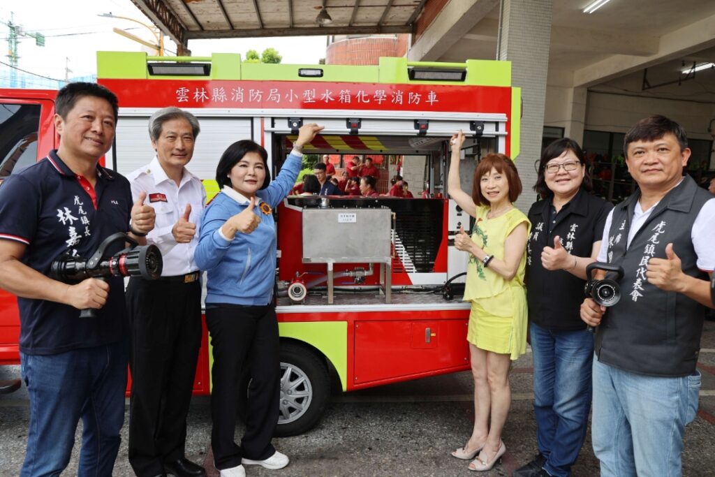 雲林縣消防局16日上午於虎尾消防分隊辦理「今子嫣女士捐贈虎尾消防隊小型水箱化學消防車典禮」,由今子嫣女士代表捐贈,張麗善縣長除代表受贈,並替雲林鄉親感謝今子嫣女士一家人化小愛為大愛的善心義舉,致上最真摯的謝意。