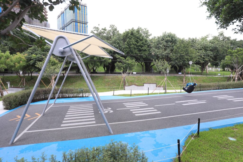 建設局說明,「飛行美樂地遊戲場」特別保留基地原始地貌及既有樹木,維持微氣候調節與滯洪功能。同時考量極端氣候的影響,增加遮陽設施優化工程。此外,遊戲場內設計循環式的遊戲動線,提供不同程度的挑戰性設施,鼓勵孩童透過探索、嘗試與反覆練習來提升自我能力,增進體能發展與社交互動。
