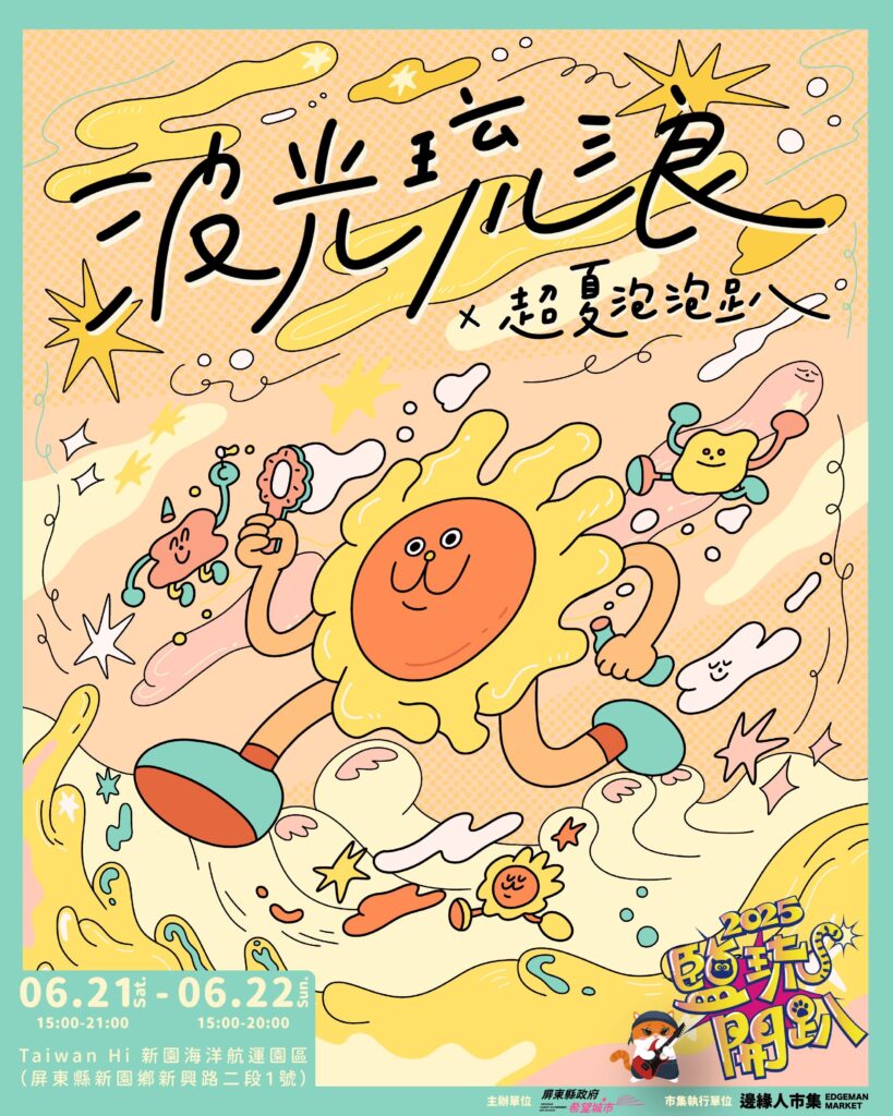 「2025鹽琉開趴」系列活動,將於6月21至22日兩天新園海洋航運園區化身成夏日狂歡樂園,盛大推出夏季場《超夏泡泡趴》,這次活動攜手邊緣人打造波光琉浪市集、日落甜點散策所、兒童戲水池、泡泡魔術師互動體驗、現場還有「園仔站長」貓咪氣球模型以及公仔等你來合照打卡領限量好禮,白天好逛好拍,晚上重量級卡司接力開唱,一起瘋泡泡!一起開趴!