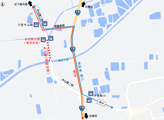 為提升下營市區防洪效能,積極爭取中央經費補助辦理「下營區下營排水閘門及抽水站新建治理工程」。為利施工順遂,市府水利局預訂自114年7月1日起封閉下營區中山路二段(下營抽水站至麻豆排水大溪橋路段)雙向車道,並預計於115年9月30日恢復通行,封路期程達一年兩個月。施工期間請行經此路段民眾,配合交維人員引導,改道至台19甲線及環營南路通行。