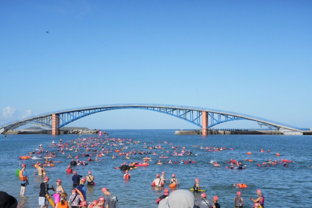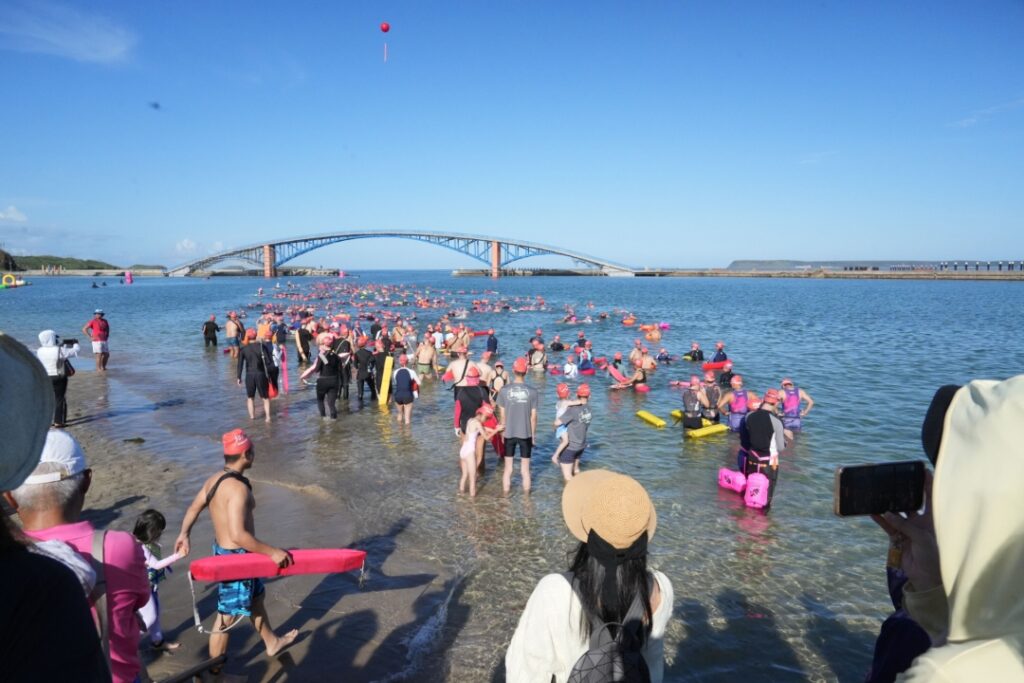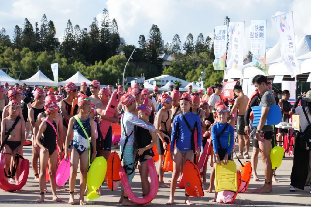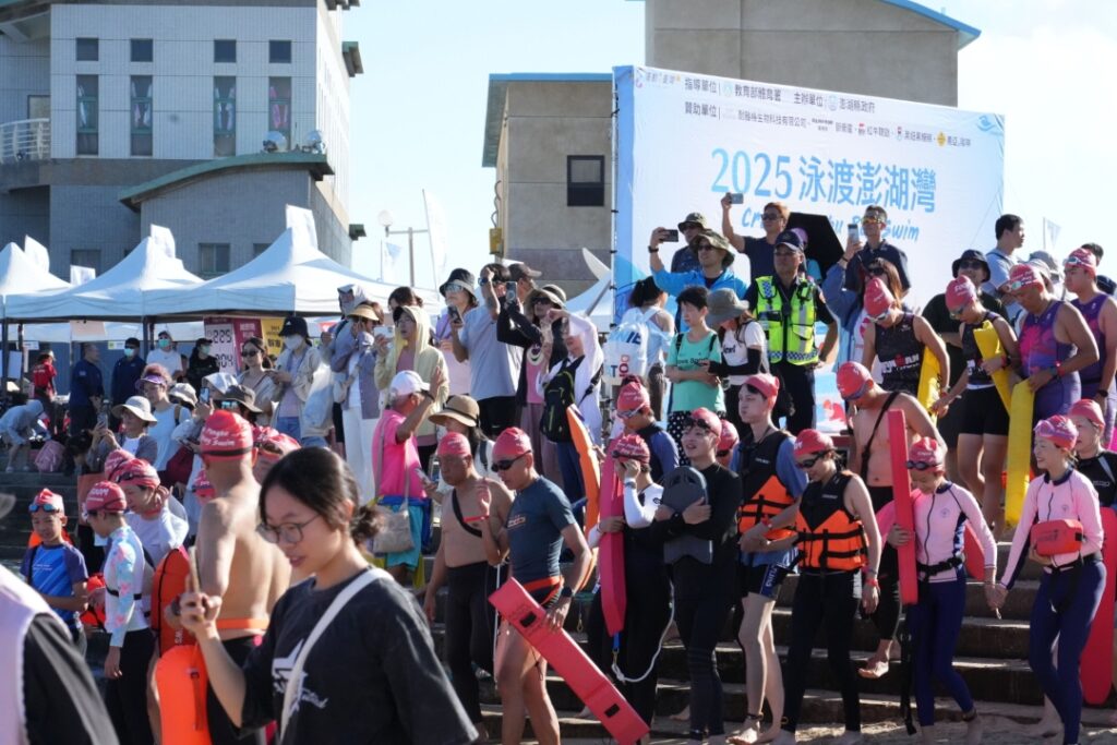 清晨時分,家長牽著孩子、游泳好手與眾多熱愛水域活動的民眾齊聚觀音亭,場面溫馨而熱烈。大家在老師的帶動下熱身、互相加油,展現出澎湖滿滿的活力與熱情。