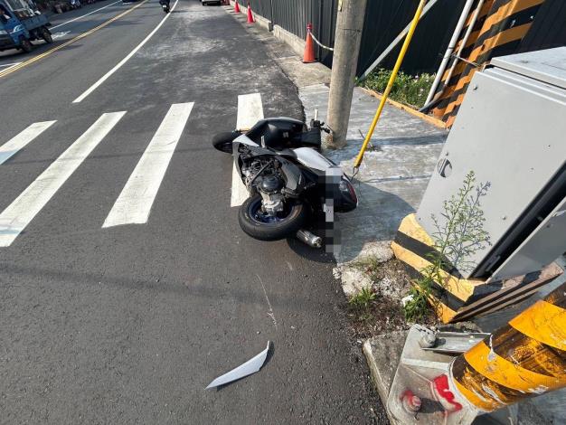 苗栗三義鄉中正路與八股路口20日15時52分許發生ㄧ起普重機車疑因閃避對向轉彎車,自撞電桿之交通事故,苗栗警分局三義分駐所獲報到場後立即協助管制疏導交通,機車駕駛受傷自行就醫。