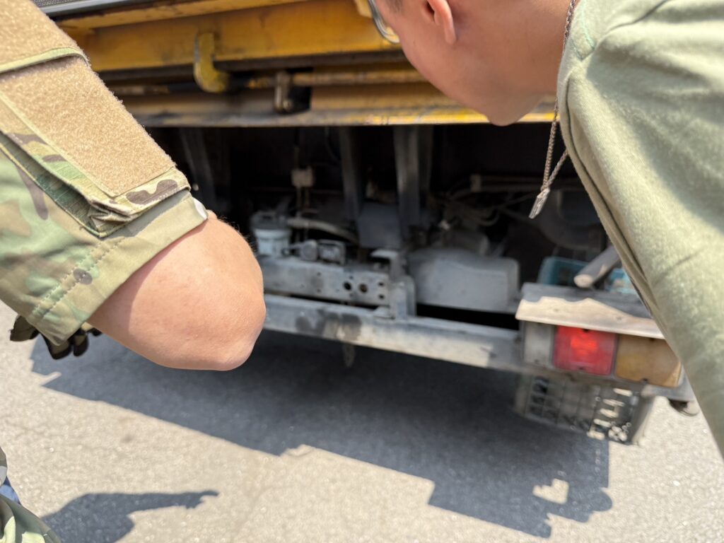 板橋區林姓及李姓清潔隊員表示,當日他們掃街車執行範圍為市區道路分隔島兩側快車道,掃街車速須保持在10公里/小時以下,期間1人開車、1人監測掃街車作業。因這幾日午後雷陣雨多、風勢強,分隔島兩側快車道累積不少落葉雜物,途中掃街車掃入落葉時隱隱約約持續有貓叫聲傳出,執行監測的清潔隊員立即關閉作業並通報動保處。動保員抵達現場評估掃街車重達17噸,底盤龐大內部結構複雜,為避免時間拖久貓咪驚嚇易亂竄深陷內部結構不易救出,在清潔隊員協助下,動保員從車底邊刷及主刷處逐一檢視,有限空間內判斷貓咪位置方向,成功救出僅約500公克幼貓。