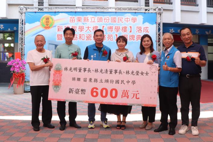 縣長鍾東錦表示,頭份國中新建教學大樓「博學樓」的順利落成,是眾人共同努力的成果,凝聚了無數心力與付出,特別感謝前任行政院長果斷決策,讓苗栗縣在無須承擔財政負擔的前提下,順利推動此項重大教育建設,堪稱最堅實的後盾,同時也感謝中央大力支持與地方齊心協力,包括基金會、林榮錦董事長與晟德集團、陳德琪團隊、潘柏德先生及福德祠等地方賢達與企業團體的慷慨捐助,攜手促成這棟承載教育希望的新校舍圓滿完工,其中一樓圖書館在基金會贊助下命名為「協和瓷善書苑」,期盼學生能在這座融合閱讀與藝術的空間中激發潛能、拓展視野。