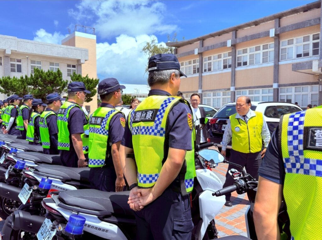 澎湖縣政府今(25)日於警察局廣場舉行「114年度購車」暨「和易贈車」交車典禮。和易國際實業有限公司慷慨捐贈縣府警察局12輛高性能警用機車,協助提升第一線警力的勤務效能與安全保障。此外,警察局亦運用114年度預算,汰換5部警用汽車及18部機車,並增購4部新機車,持續強化警用裝備,確保同仁執勤安全無虞。