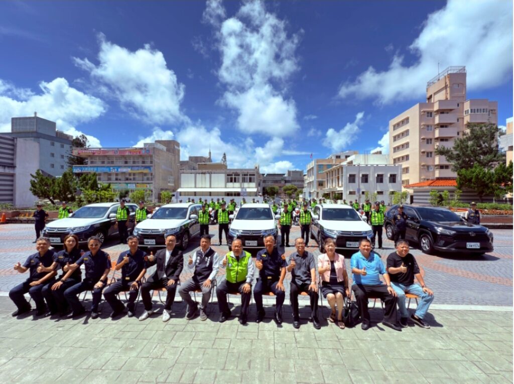 澎湖縣長陳光復親自出席交車典禮,將象徵「114年度採購警用汽機車」的鑰匙立牌交予警察局長林温柔,完成新車正式交接。林局長亦代表警察局接受和易企業捐贈的12輛機車,並頒發感謝狀,由執行長楊國樑代表接受。