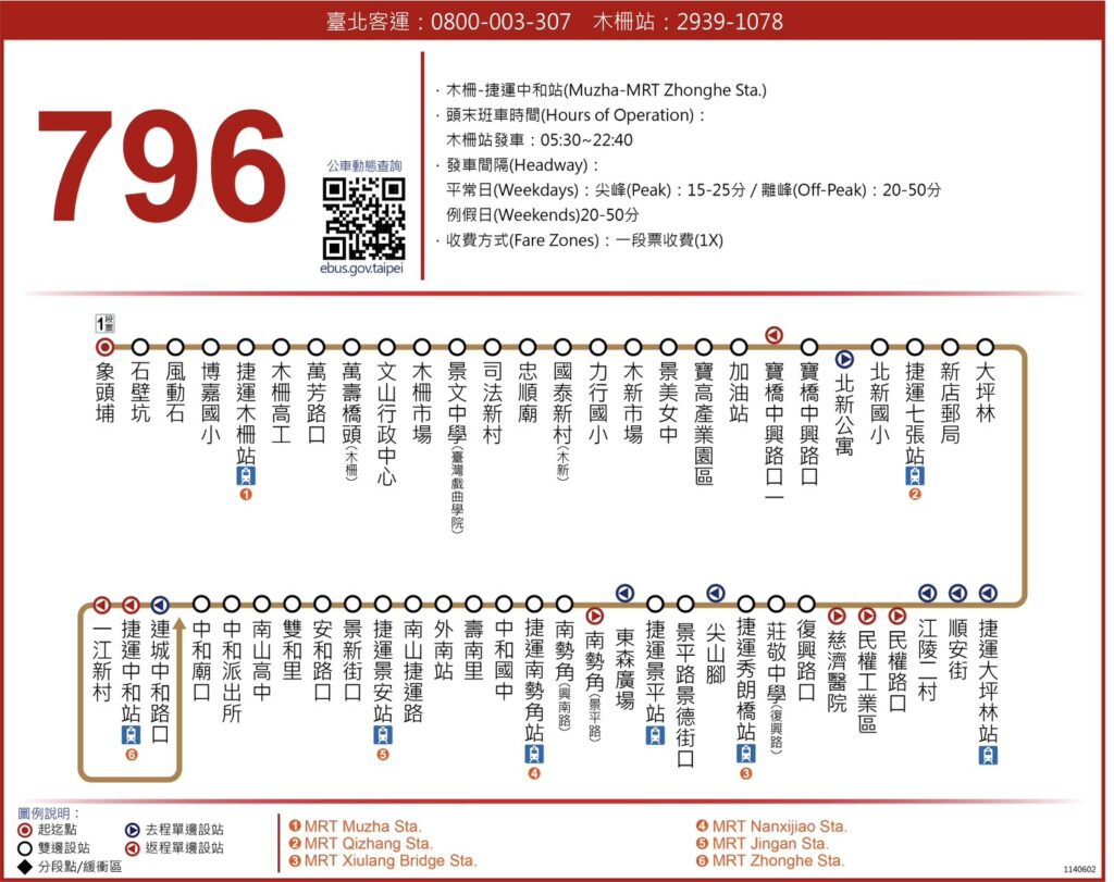 為配合臺北市捷運環狀線南環段工程施工,臺北客運796公車發車站位自7月1日起從木柵站遷移到象頭埔站,同步試辦調整行駛動線為「木柵-中和」,敬請乘客注意。
