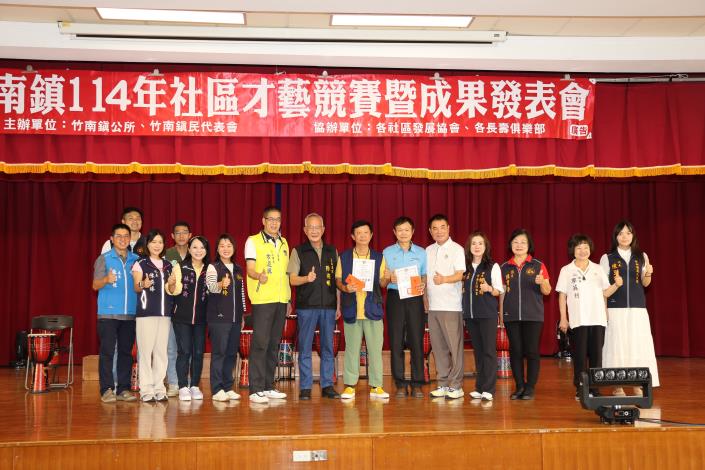 29日竹南鎮社區才藝競賽暨成果發表會於公所3樓演藝廳登場,今年隊伍樂團組有4隊、歌謠組有15隊、創意特色有3隊及舞蹈組有18隊,總計40隊,所有參賽隊伍卯足全力,將平日練習之成果充分展現,並從中相互觀摩學習,享受活動的歡樂氛圍。