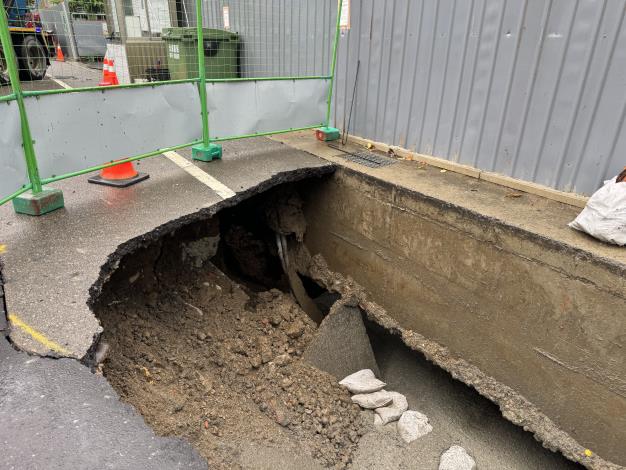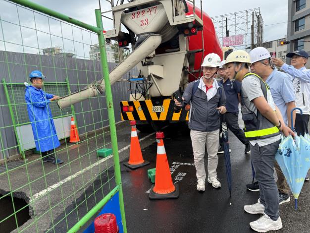 接獲通報後,縣府工商發展處立即會同社團法人中華民國大地技師公會派員至現場會勘,並緊急進行混凝土灌漿回填作業,現場除封閉道路外,同時設置交通錐與夜間警示設施,全力維護用路人與居民安全。