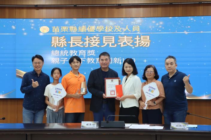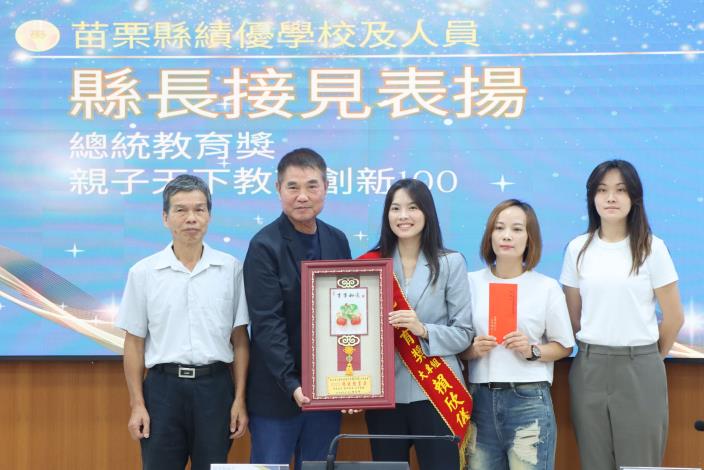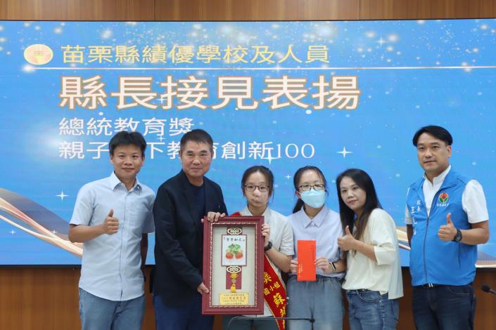 縣長鍾東錦指出,今年苗栗縣兩位傑出學子,烏眉國小的蘇翊捷同學與現就讀國立臺北護理健康大學的賴欣儀同學,榮獲「2025總統教育獎」,他們自幼面對身體挑戰,卻以堅定意志與不懈努力,突破有形障礙,展現感人的毅力與生命力,令人感佩;鍾東錦頒贈兩學子小紅包與獎牌致賀,並期勉再接再厲。三灣國小大坪分校教師團隊則以「AI時代,如何幫助孩子成為更有智慧的人」為核心理念,贏得「2025教育創新100」殊榮,鍾東錦肯定教學團隊融合在地農業、環境議題與語文教育,激發學生潛能與世界連結,即使身處偏鄉,只要有熱忱與專業,教育依然能綻放光彩。