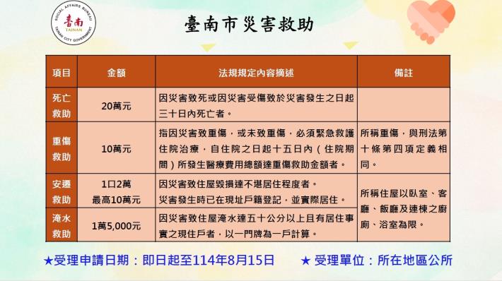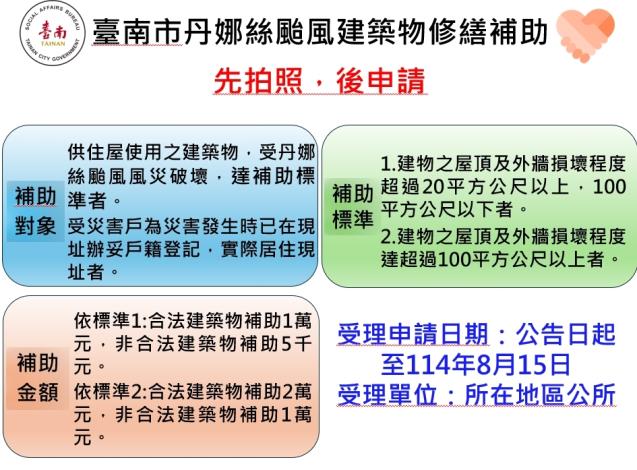 針對丹娜絲颱風災損,台南市政府提出六大補助與慰助標準,包括: