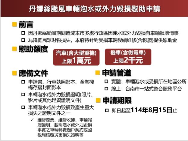 為全力協助丹娜絲颱風災後重建復原,台南市長黃偉哲指示市府團隊以災民需求為優先,針對風災造成的死亡、重傷、房屋毀損及車輛毀損泡水等情況,提出相關補助與慰助標準。台南市政府副秘書長尤天厚今(10)日下午代表市長,率社會、民政、交通及工務局等相關局處說明災損補、慰助標準。自即日起至114年8月15日,民眾可檢附相關證明及單據向受災地區公所提出申請。黃偉哲也特別要求各區公所秉持「從速從簡」原則,加快審查流程,將補助金儘速送達災民手中,協助民眾盡早恢復正常生活。