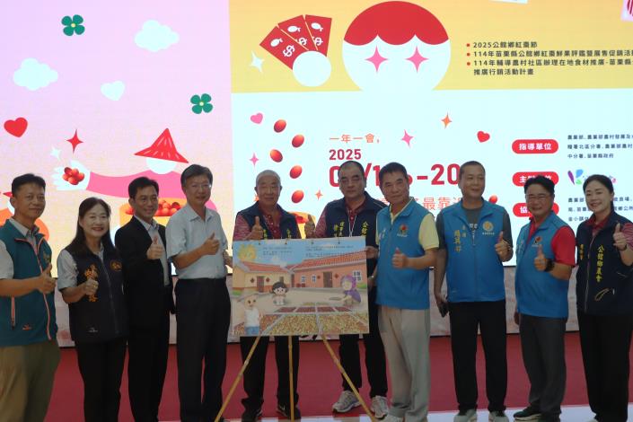 縣長鍾東錦16日偕同農業處副處長蔡政新、農村發展及水土保持署台中分署分署長陳榮俊、立委邱鎮軍特助張朋輝、議長李文斌、議員孫素娥、曾美露、張志宇、鄭碧玉秘書饒鳳珠、公館鄉農會理事長徐集明、常務監事張肇樣以及總幹事林幼詩等各界代表,共同為「2025苗栗公館紅棗節」揭開序幕。