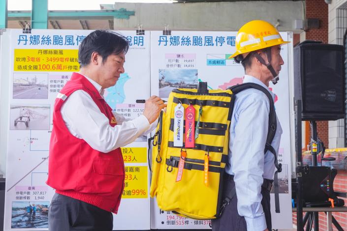 日前丹娜絲颱風侵襲台灣南部,在台南地區造成1940支電線桿倒塌,約有30萬用戶曾停電,使災區民眾生活極為不便。經全國各地的台電員工趕赴台南,日夜搶修供電,迄今已全部恢復供電。台南市長黃偉哲今(18)日陪同賴清德總統前往台電新營區營業處慰勞台電員工,賴總統頒發榮譽勳章及致贈加菜金,表揚及感謝搶修人員勞苦功高。