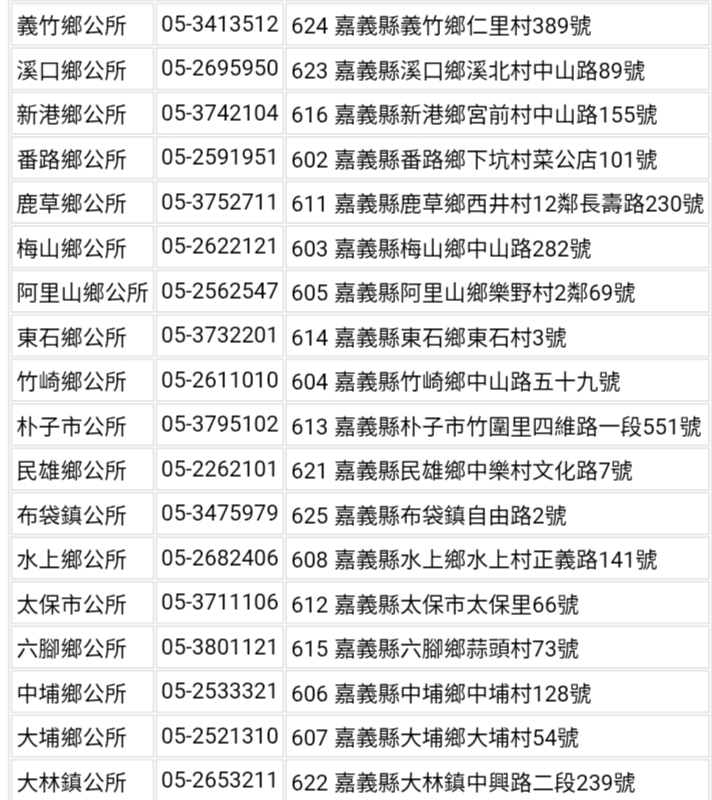 嘉義縣各鄉鎮市公所聯絡資訊: