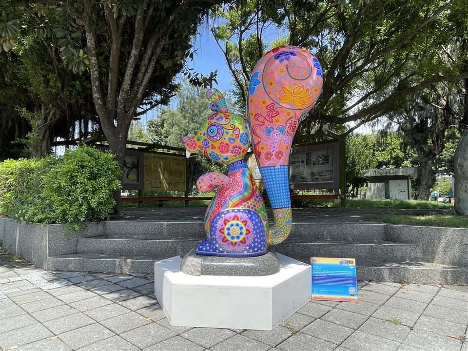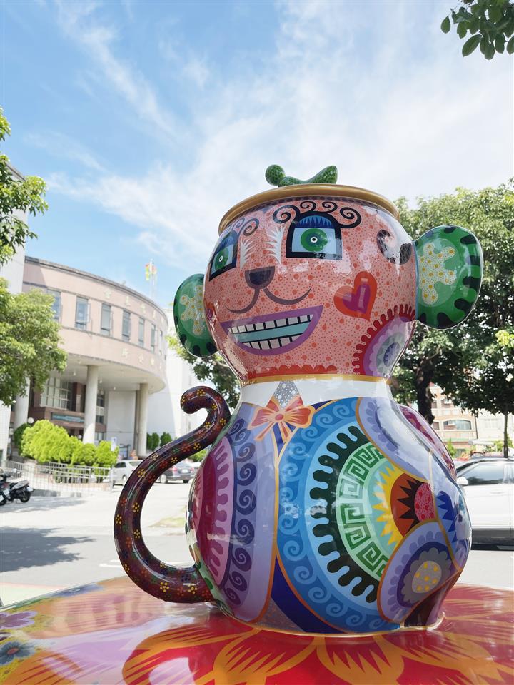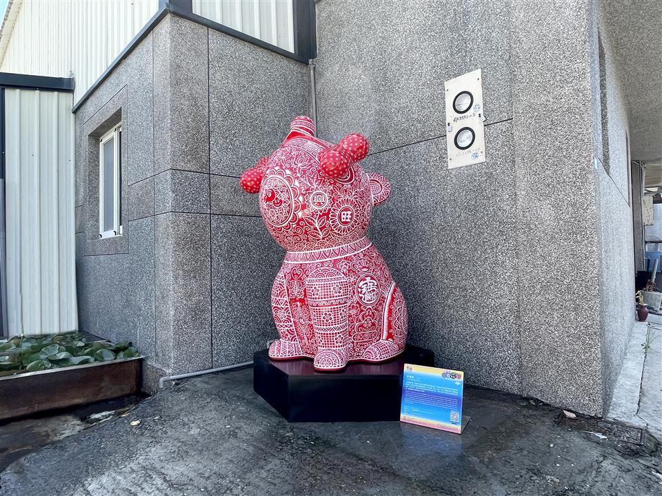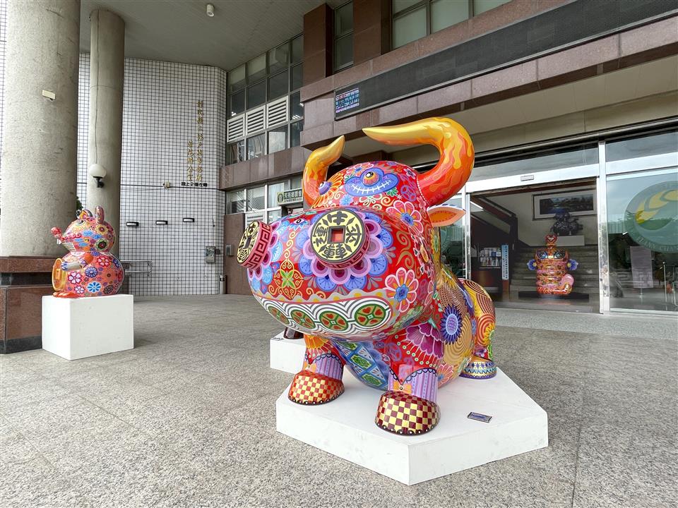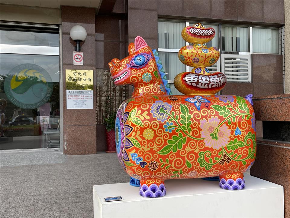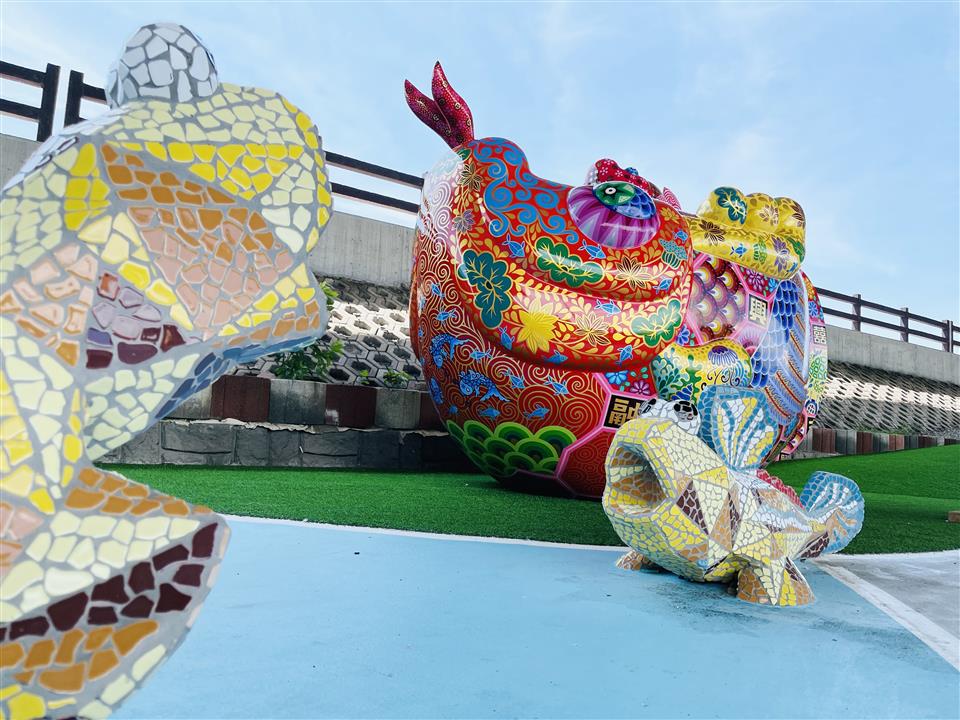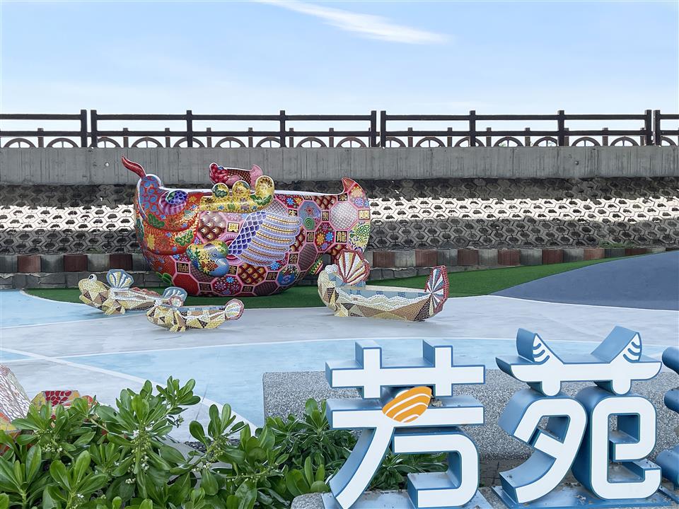 此次共展出 11 件大型雕塑,展期自即日起至 8 月 31 日,展品以洪易老家為起點,串聯鄉內多個地點,勾勒出一條饒富故事性的「芳苑藝術地景路線」。其中,鄉公所廣場的《牛轉乾坤》與傳統牛車對話,象徵芳苑勤勞精神與時代轉變;漁民廣場的竹筏承載著《金龍魚》,隨潮汐變化閃爍光芒,象徵當地漁業豐饒;芳苑國小轉角的《鬆鼠》則帶來童趣與活力;而在洪易老家門口的《有狗旺》,則化身為守護家鄉的祝福象徵。這些作品不僅妝點了日常生活場域,更邀請民眾以雙腳走讀地方故事,親身感受藝術家的深情與記憶。