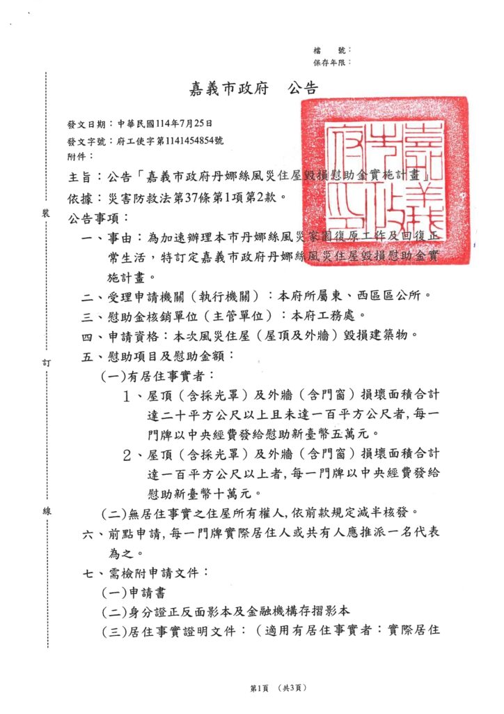 嘉義市政府已公告「丹娜絲風災住屋毀損慰助金實施計畫」,本所受理說明如下: