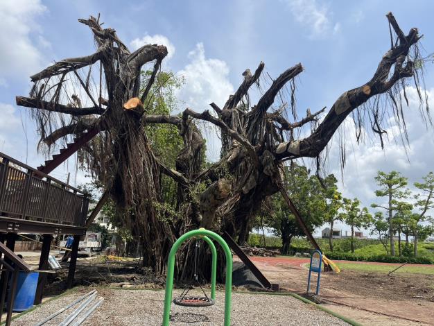 麻豆區安業國小一棵見證逾120年校史的珍貴老榕樹,於7月7日遭強颱丹娜絲強風吹襲不幸倒伏。在校方積極奔走、地方企業熱情挹注與市府通力協助下,經專業搶救與吊掛工程,老榕樹日7月26日完成扶正作業,重獲新生,續為校園庇蔭、守護地方記憶。