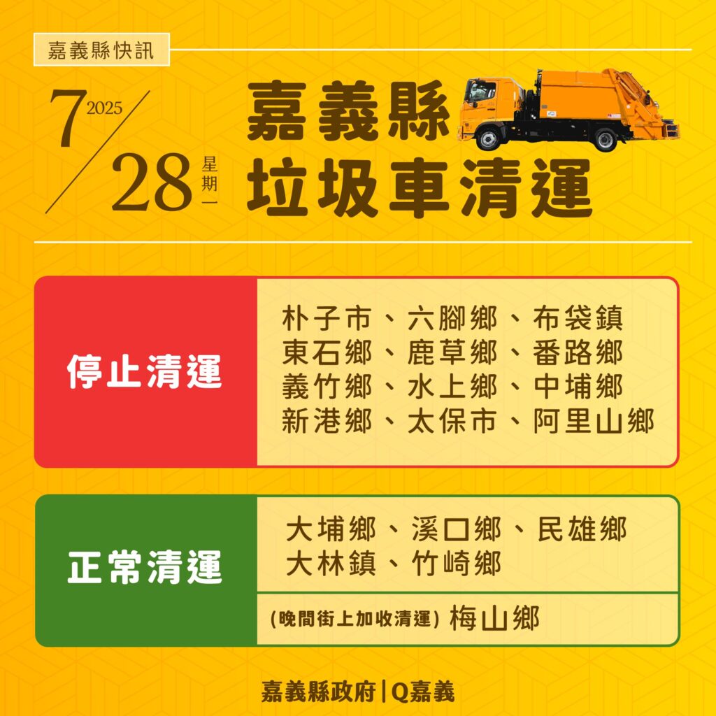 因今日豪大雨來襲,嘉縣各鄉鎮市公所垃圾車7/28(一)收運作業如下,造成不便,敬請見諒。
