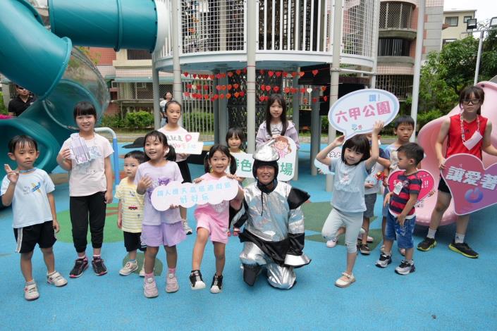 「北區就是孩子的遊戲場」今年已陸續啟用大和公園喜鵲溜滑梯、華德公園雙塔攀爬網,今天開放啟用「六甲公園錫人樵夫高塔遊戲場」,這次以《綠野仙蹤》童話故事的「錫人樵夫」、「獅子」及「稻草人」為主角,北區是本市首創採用童話故事串連北區特色公園,營造一系列的童話故事魔法遊戲場。