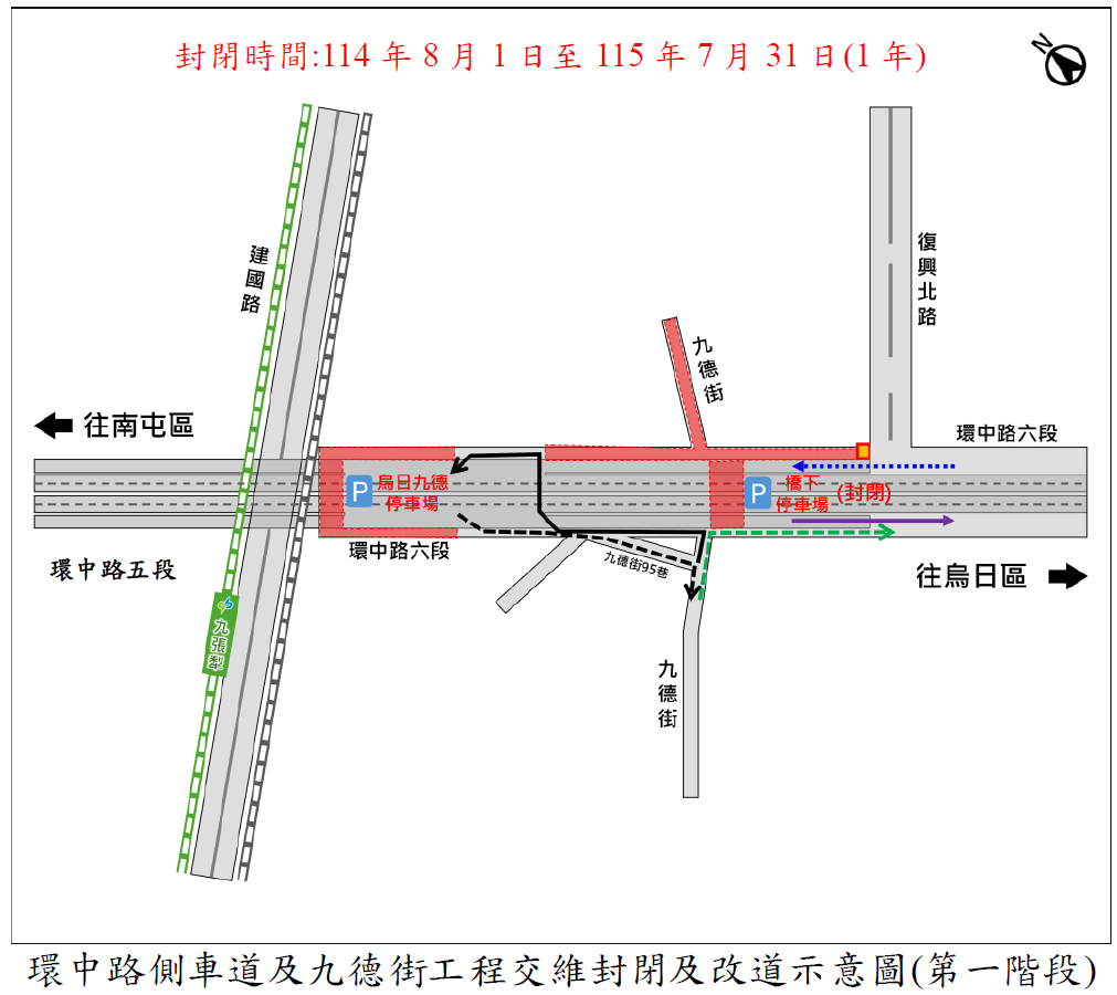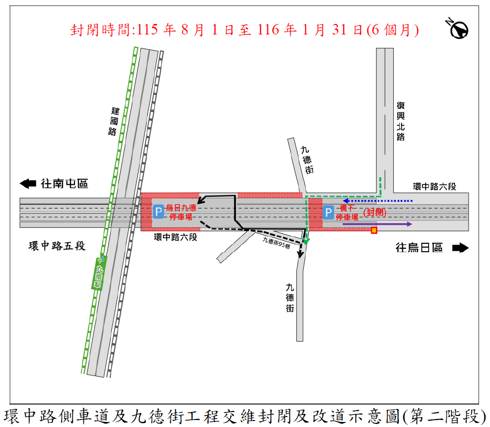 地政局表示,為配合環中路六段拓寬工程施工,原行經環中路六段側車道及烏日九德停車場,請改由環中路六段往南、中山路往西、中華路往北及九德街往東北接回環中路六段橋下。
