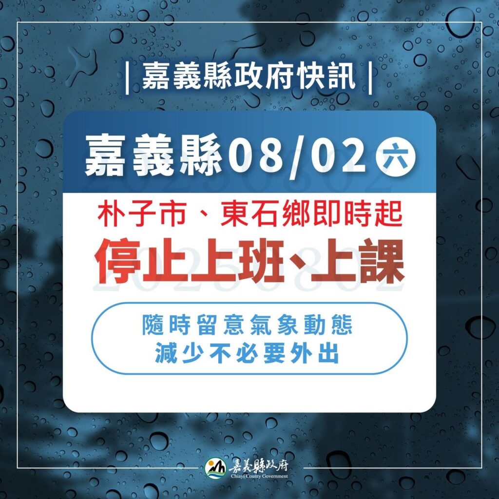 嘉義縣朴子市、東石鄉8月2日即刻停止上班、停止上課