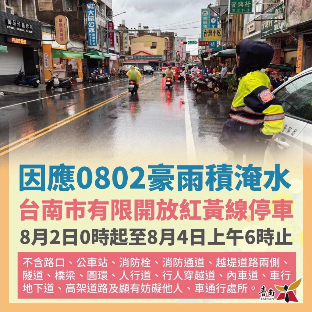 台南市因應114年8月2日大豪雨致部分地區或大樓地下室積淹水,民眾有臨時移置車輛停放需求,台南市政府宣布自114年8月2日0時起至8月4日上午6時止,全市道路紅黃線有條件開放停車。