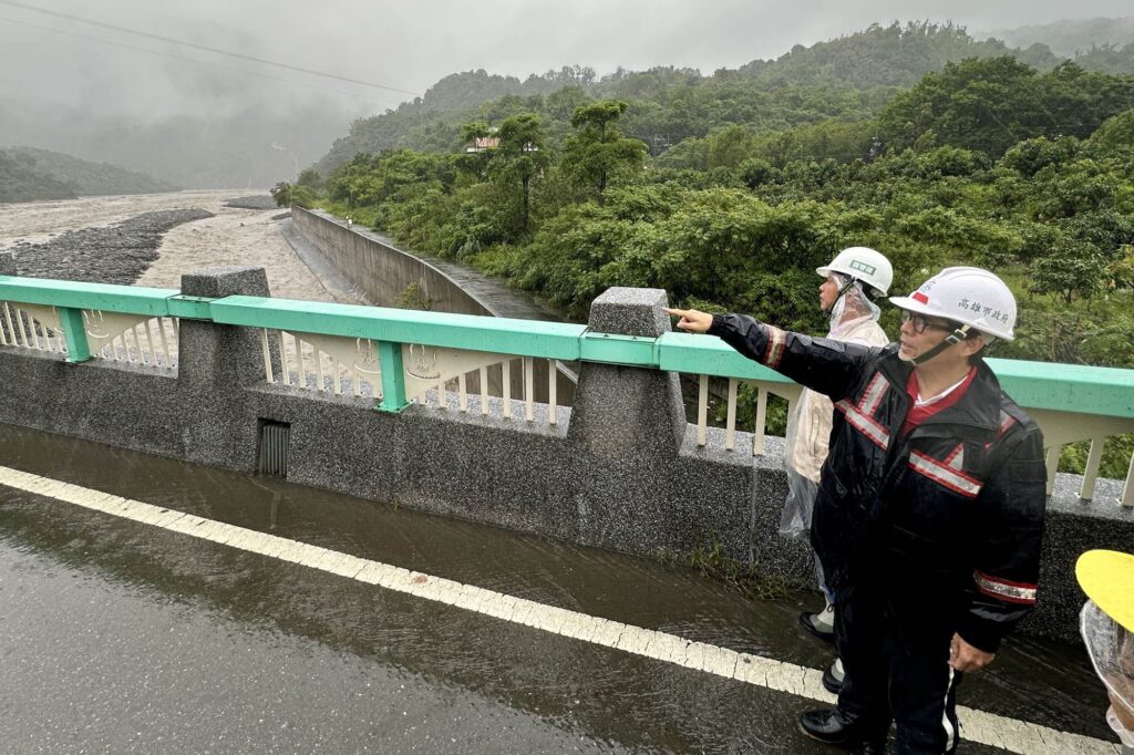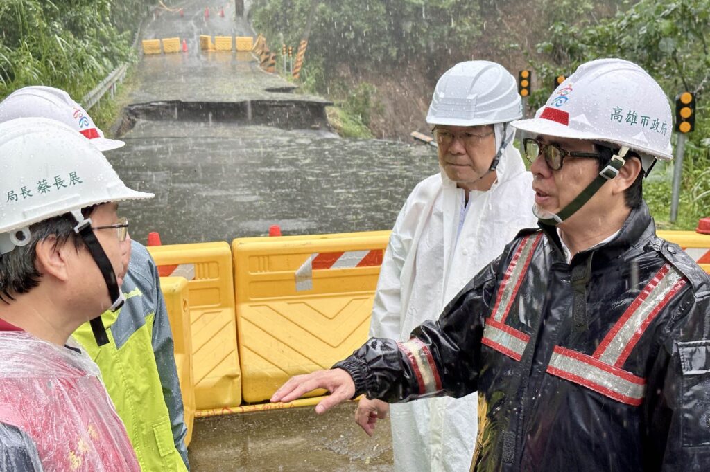 隨後,陳其邁市長轉往高131線諦願寺段勘災,該處原已進行橋梁外推等重建工程,此次豪雨又致9K+800處邊坡滑落、道路封閉,再度中斷交通。陳其邁除要求加快工程評估與邊坡防護規劃,並研擬替代通行路線,確保居民出入無虞,同時指示工務局會同技師公會進行地質安全評估,納入高風險地區長期治理計畫。