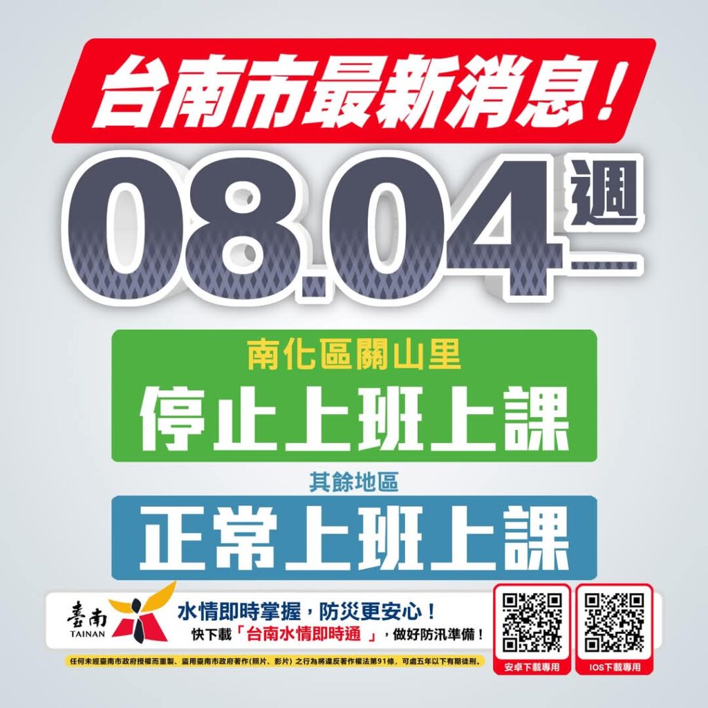 台南市宣布8月4日南化區關山里明停止上班,停止上課,其餘地區照常上班、照常上課 台南市政府公告 根據中央氣象署豪雨監測預報,今(8/3)日下午4時預測台南市24小時雨量,未達停班停課標準,惟南化區關山里因南179縣連日豪雨,多處路段土石坍方,對外交通受阻尚未修復,間歇性雨勢仍有坍方或致災之虞,為維護該里里民及轄區內瑞峰國小教職員工安全,南化區關山里明(8/4)日停止上班,停止上課,其餘照常上班、照常上課。 文章導覽 Previous Post強降雨致雲林多處災情!縣府勘災:期中央地方共同治水Next Post嘉義縣梅山鄉、竹崎鄉、番路鄉、大埔鄉、阿里山鄉8/4停止上班、停止上課 2025 年 8 月 3 日 寶島日報編輯部 台南新聞 在〈台南市宣布8月4日南化區關山里明停止上班,停止上課,其餘地區照常上班、照常上課〉中留言功能已關閉