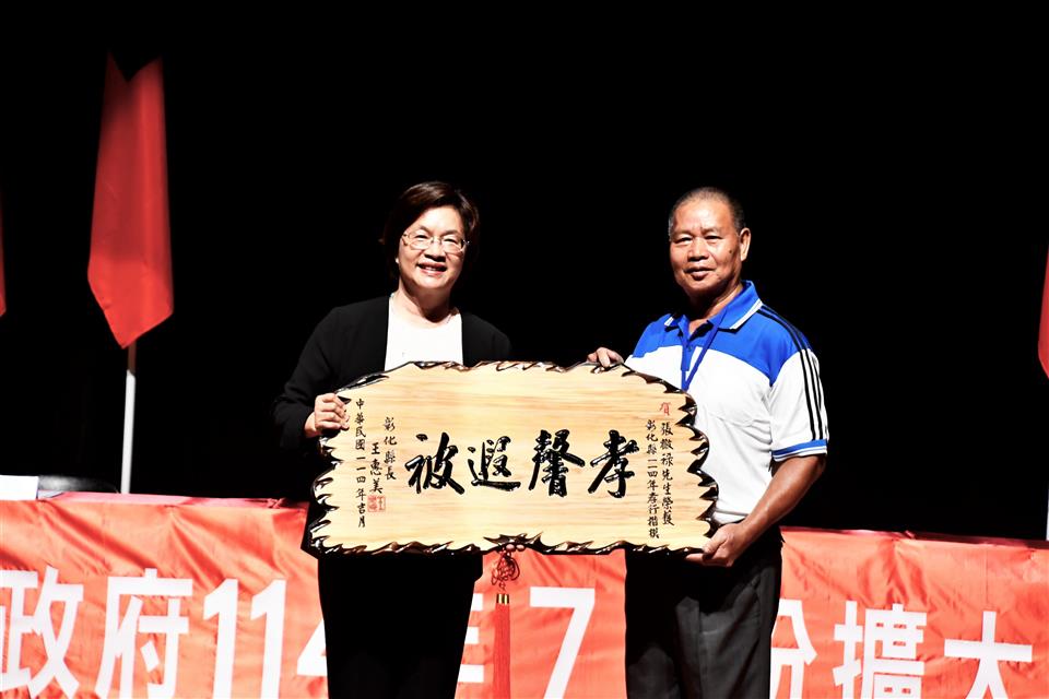 為弘揚孝親精神、推崇孝道倫理,彰化縣政府於114年7月29日擴大主管會報中表揚年度孝行楷模,由縣長王惠美親自頒發孝行楷模匾額,表揚張橄祿先生、黃坤炎先生及張家軒同學3位孝行楷模,肯定並嘉許其長年以來無私奉獻、孝親至誠的感人事蹟,其中張橄祿先生更榮獲內政部「114年全國孝行獎」,足為社會典範。此次獲獎的3位孝行楷模背景雖各異,然皆展現出不分年齡、環境與能力的孝行實踐,充分體現家庭與社會溫情。