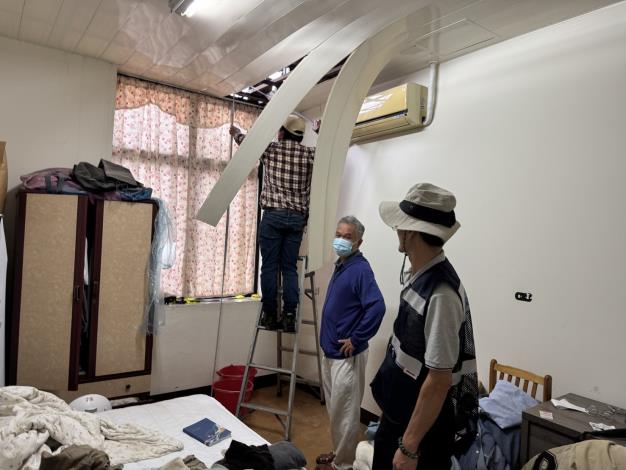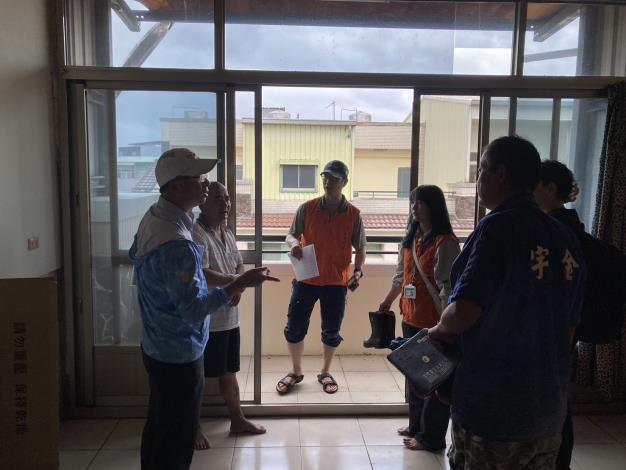 安南區公所4日由魏文貴區長、許德安主任秘書會同農業部農村水保署及媒合廠商,由本區里幹事帶同前往登記有媒合意願之受災戶家中,進行災後房屋修繕現場勘查,總計動員62人,分區前往執行屋損修繕勘查。