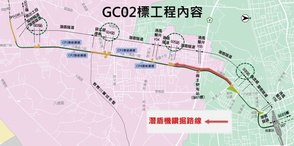 捷運工程局表示,捷運綠線在八德地區自桃園火車站以南至八德區介壽路二段,路線採地下化設計,隧道全長約10.52公里,由直徑6.24公尺的潛盾機鑽掘構築,包含上下行線,共有10條隧道,目前已貫通了2條隧道,今年底八德地區7台潛盾機將同時發進,預計116年將10條潛盾隧道全部貫通。
