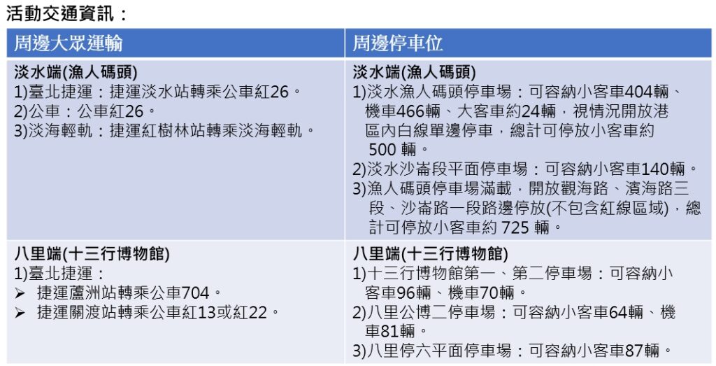 漁人碼頭港區內停車場煙火秀當日(8/10、17、24)自上午10點起採進場一次性收費(小客車90元/次),無30分鐘免費優惠;港區內停車場滿載時,將禁止車輛進入漁人碼頭,並開放港區外圍部分道路(觀海路、濱海路三段、沙崙路一段)路邊停車(不包含紅線區域),請依現場員警、義交指引至路邊停放;另漁人碼頭港區外還有計時收費的淡水沙崙段平面停車場供民眾停車。