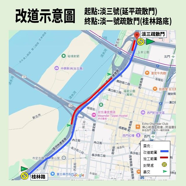 為維護施工安全,桂林疏散門(桂林路與環河南路口)及延平疏散門(鄭州路與環河北路口)將暫時封閉,建議改道行駛環河南路。