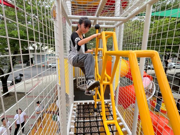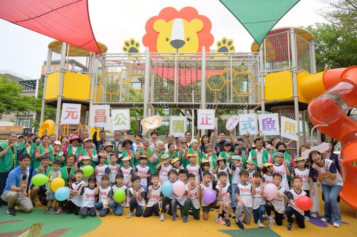 來到元美里「元昌公園獅子高空攀爬網」活動現場,則由元美里侯喬蓁里長扮演桃樂絲,帶領皇佳幼兒園太鼓隊開場表演,在鼓聲熱鬧的氛圍中,由長官貴賓親手為孩子們戴上手繪的獅子面具,象徵「鼓鼓生風,吼哩勇氣」。現場梁姓11歲的小朋友說從來沒玩過這麼高的攀爬網,她站在最上面的時候,那個高度懸空在半空中的感覺,超刺激,下次再約同學們一起來挑戰!