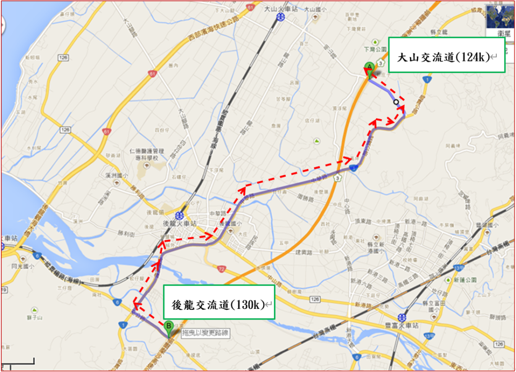 (二)改道路線2:請往南繼續行駛於後龍交流道(130k)南下出口匝道駛出,後龍交流道(國3)→至公路→中華路(台1) →明山路→大山交流道(國3)。