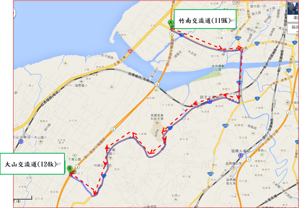 (一)改道路線1:請提前於竹南交流道(119k)南下出口匝道駛出,竹南交流道(國3)→全天路(台13甲)→仁愛路(台1) →明山路→大山交流道(國3)。
