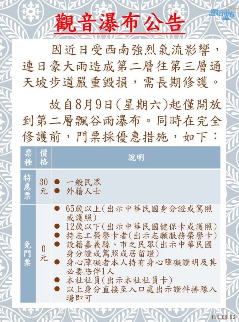 觀音瀑布因近日受強烈西南氣流連日豪大雨影響,造成第二層往第三層通天坡步道嚴重毀損,需長期修復,故自8月9日起只開放到第二層飄谷雨瀑布,同時在完成修復前前門票採取優惠降價措施。