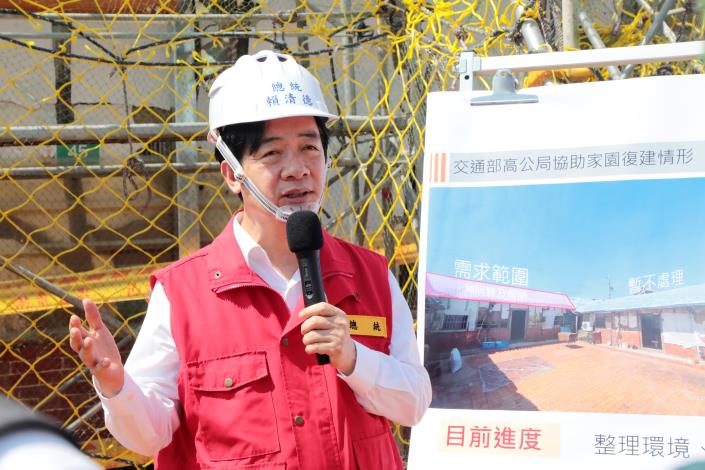 今日下午賴總統首先前往新營區姑爺里,聽取交通部高速公路局說明修繕進度,並逐一慰問施工人員並關心工程安全。交通部高公局指出,嘉南地區受損家戶眾多,該局負責新營區及後壁區修繕媒合,新營區共登記346戶、其中弱勢戶33戶,已完成媒合48戶。今日視察的案戶由曾獲金安獎、金質獎的威勝營造負責施工,高公局表示,將確保專業團隊以高效率高品質完成修繕,協助居民盡快重建家園。