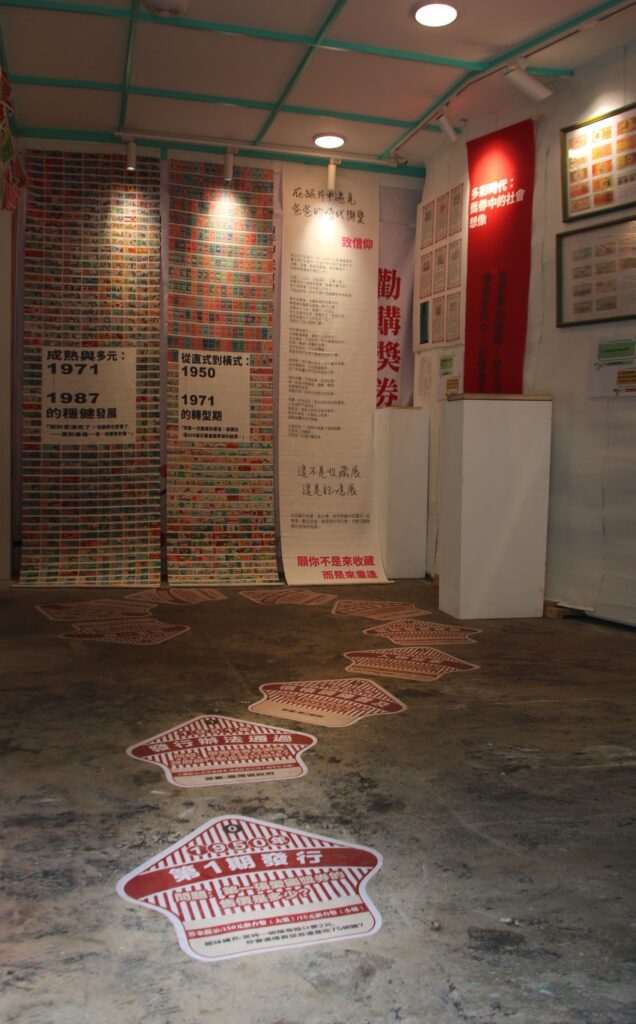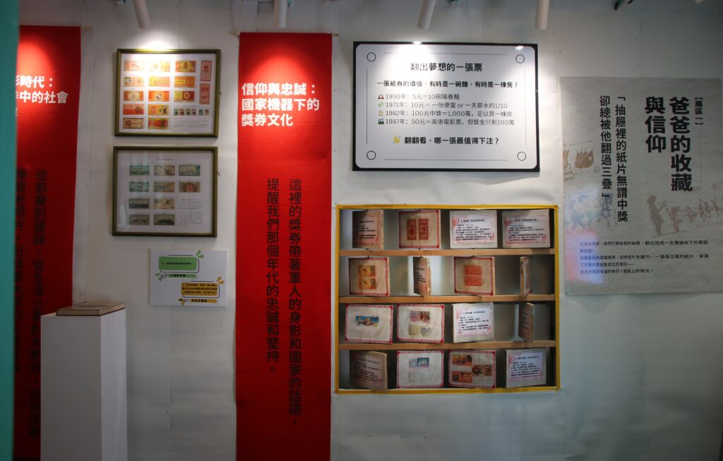 展覽首區以〈爸爸的收藏與信仰〉為題,深入刻劃羅爸爸從集郵轉向獎券收藏的生命歷程。透過展示冊、老式行李箱與一則則的語錄小語,讓人彷彿走入他的書房,嗅到紙墨與歲月交織的氣味。展區中並設有策展人與收藏者之子共同策劃的《愛國籤詩|命運密碼》,每一期獎券搭配一句深情小語,不占卜財運,卻字字句句說著庶民對未來的盼望與安穩的信仰。