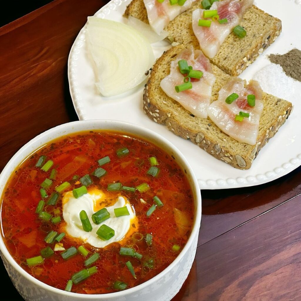 店內的烏克蘭招牌菜中,最引人注目的莫過於味道生猛的「鹽醃肥生豬肉佐洋蔥」。佐里娜解釋,當地居民早期會將生豬肉用鹽巴醃製,這樣不僅能長期保存,還能在冬季糧食匱乏時,為農民提供熱量來源。翁縣長在老闆的帶領下,體驗手切鹽醃肥豬肉,了解其獨特的醃製與品嚐方式。