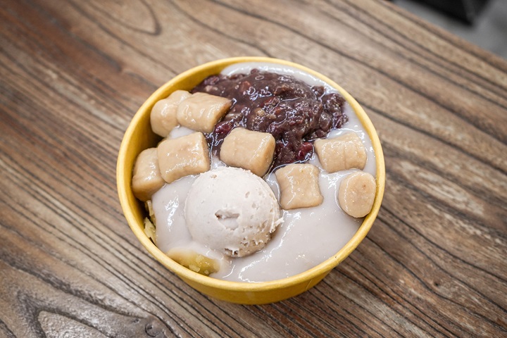 想吃甜點的話,阿爸的芋圓絕對是首選,他們的芋見泥蔗片冰以口感滑順芋泥、搭配Q彈芋圓、白芋湯圓、粉圓與薏仁層層堆疊在細緻的甘蔗冰上,蔗片冰還帶有淡淡的煙燻香氣。想要更豐富的享受,也可以加點配料升級。店內也提供熱紅豆湯,這道經典甜品溫潤人心,令人回味。