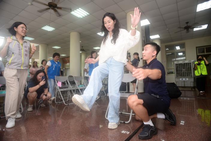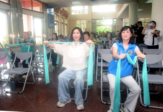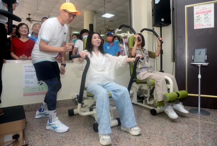 縣長夫人陳美琦稍後也在教練指導下一一體驗設施,並與與會長者一起進行彈力帶伸展,增強水平肩部平衡及下肢肌力訓練及肌少症篩檢等。