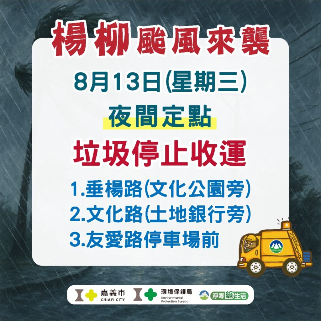 因應楊柳颱風來襲!嘉義市8月13日夜間定點垃圾停止收運 嘉義市環保局緊急公告嘉義市因應楊柳颱風來襲,為了清潔隊員與民眾安全,於8月13日22時20分至8月14日5時20分,夜間定點垃圾停止收運。 請民眾減少外出,並注意自身安全,隨時留意颱風動向,做好防颱準備。 文章導覽 Previous Post嘉義縣8/13停班課!各鄉鎮市公所垃圾車收運異動公告Next Post斗六文旦再過10天採收 農民祈挺過颱風考驗 2025 年 8 月 13 日 寶島日報編輯部 嘉義新聞 在〈因應楊柳颱風來襲!嘉義市8月13日夜間定點垃圾停止收運〉中留言功能已關閉