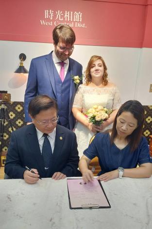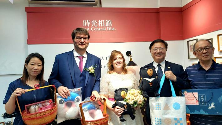 來自德國的新人Martin Beck 與Greta Ott特別選擇在台南完成終身大事,為他們的愛情故事增添一抹濃郁的古都色彩。為了表達祝福與歡迎,台南市政府觀光旅遊局特別代表黃偉哲市長,準備象徵「長長久久」的「大腸包小腸+烏魚子手工皂」禮盒、溫柔療癒的頸枕,讓幸福有個靠山-魚頭君頸枕以及其他精緻好禮,並由丁玲琍專門委員代表致贈,獻上最誠摯的祝賀。台南市中西區戶政事務所亦全力協助,使整個結婚登記流程順暢溫馨,讓新人在異地也能感受賓至如歸的幸福氛圍。