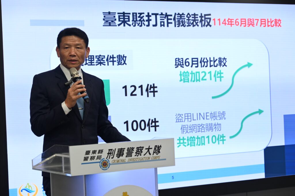 警察局局長蔡燕明指出,根據內政部警政署165打詐儀錶板顯示,臺東縣114年7月份受理詐騙121件、財損金額新臺幣(以下同)1,247萬元,遭詐件數增加21件,財損金額較6月份減少2,160萬元,其中財損金額最高仍為假投資詐騙,顯示此類詐騙手法仍具高度危害,亟需持續防治及宣導。