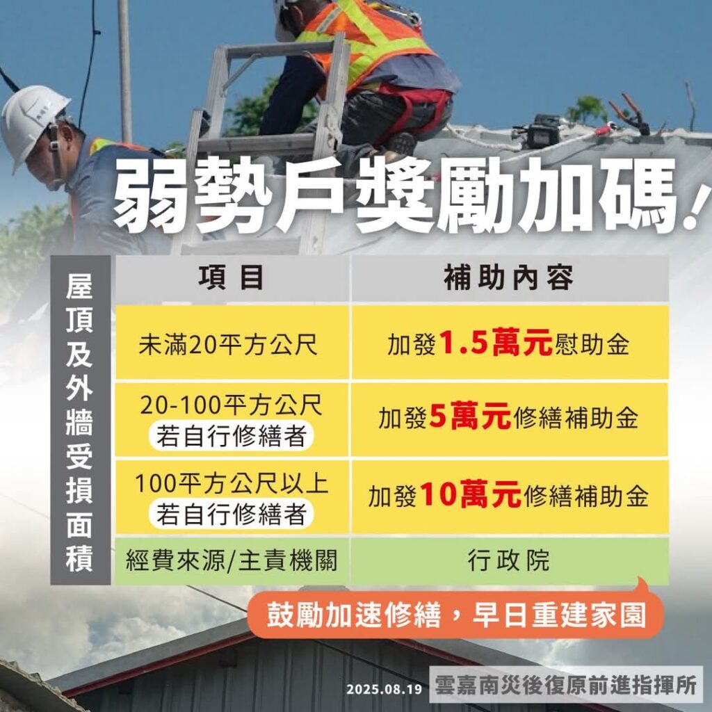 行政院雲嘉南災後復原前進指揮所今(19)日宣布,針對已自行修繕的弱勢家庭,除原有家園復原慰助金外,再加碼完工補助,最高可領10萬元,確保每個弱勢家庭都可獲得公平照顧。