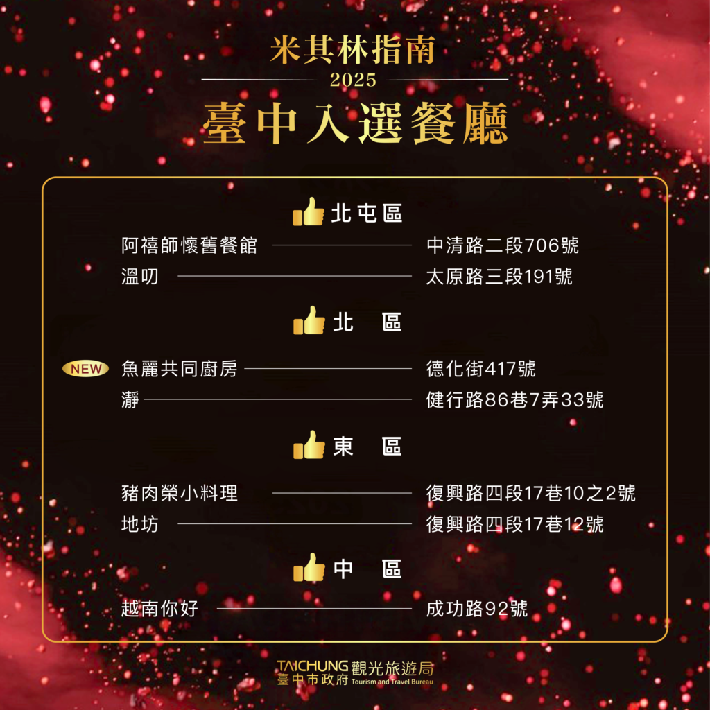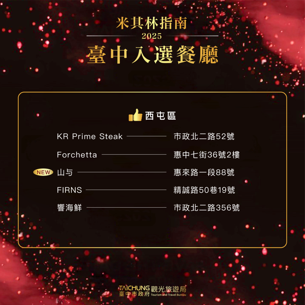 觀光旅遊局長陳美秀表示,從山陵到海濱,台中的味道來自土地的真誠饋贈,這裡有豐富的天然資源,讓最新鮮的食材以最短的距離抵達餐桌,職人們以巧妙的廚藝展現料理無限可能性及對遊客的無限吸引力,將自然的鮮甜原封不動地端上每一道菜。摘星餐廳包括全球第一家米其林三星新加坡料理餐廳「JL Studio」;蟬聯六屆米其林一星的「鹽之華」、「俺達的肉屋」,五屆米其林一星的「澀」,兩屆米其林一星的「元紀」、「L’Atelier par Yao」,還有本市第一家受綠星肯定的「地坊」。料理人的精湛廚藝與卓越服務越來越受國際肯定,無論是追求創新饗宴、尋找異國風情、傳承道地技藝,台中都能滿足饕客的味蕾,展現這座城市兼容並蓄的飲食文化魅力。